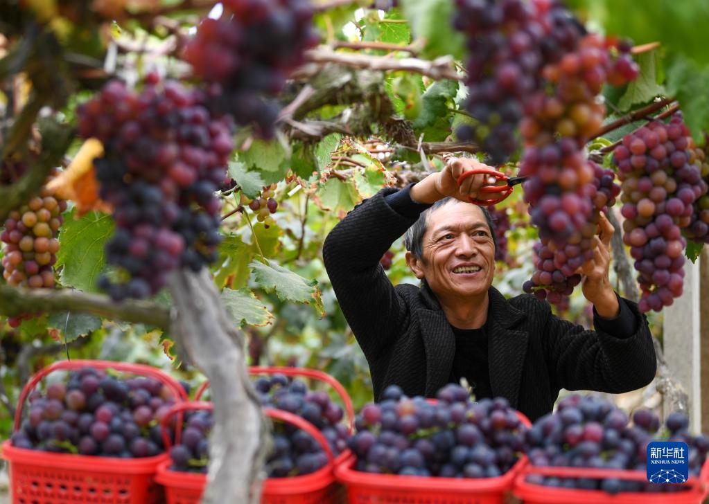 10月10日,農(nóng)民在貴州省黔東南苗族侗族自治州凱里市三棵樹(shù)鎮(zhèn)采摘葡萄。