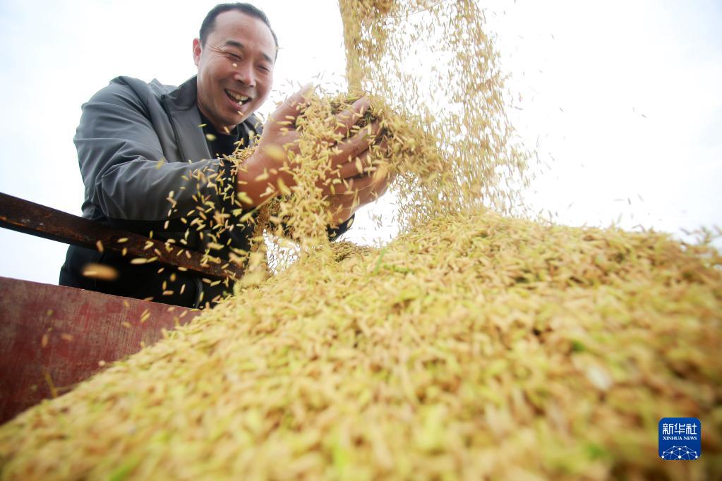 10月9日,在江蘇省儀征市陳集鎮(zhèn)友好村,農(nóng)民在收獲水稻。