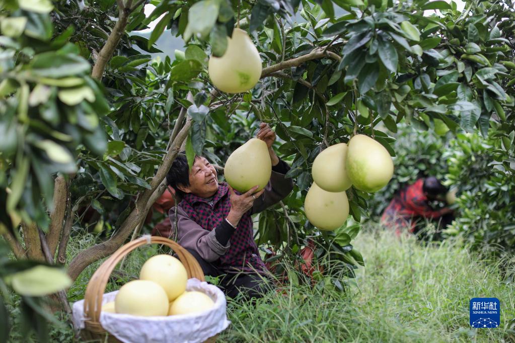 10月10日,果農(nóng)在貴州省遵義市綏陽(yáng)縣風(fēng)華鎮(zhèn)雙龍村采收柚子。