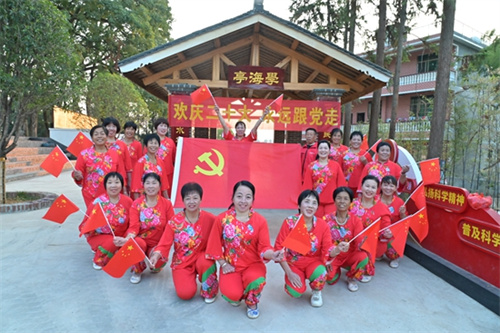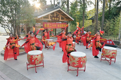 10月16日,湖南省美麗鄉(xiāng)村隆回縣金石橋鎮(zhèn)黃金井村文藝志愿者載歌載舞歡慶黨的二十大勝利召開。該村群眾生活富裕后,精神文化生活豐富多彩,當(dāng)天該村文藝志愿者自發(fā)表演《歌支山歌給黨聽》《醉美威風(fēng)鑼鼓》,歌頌祖國感恩黨,表達(dá)對共產(chǎn)黨的無比熱愛之情。(賀上升攝)