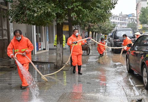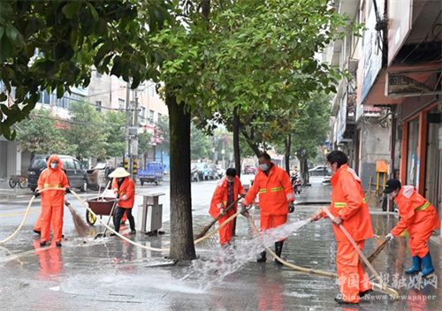 10月30日,湖南省隆回縣金石橋鎮(zhèn)城管中隊(duì)工作人員正在對(duì)城區(qū)街面進(jìn)行灑水消毒。疫情期間,該鎮(zhèn)42個(gè)核酸檢測(cè)采樣點(diǎn)和城區(qū)街道,定期進(jìn)行全面消毒處理,做到無(wú)遺漏、無(wú)死角、無(wú)隱患。(賀上升攝)