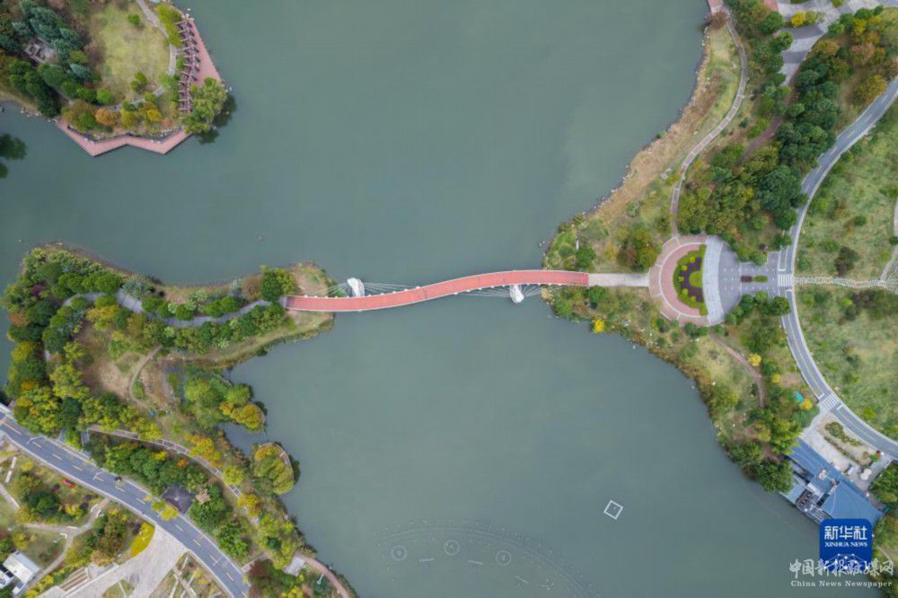 這是11月12日在常德城區(qū)拍攝的白馬湖文化公園景色(無人機(jī)照片)。