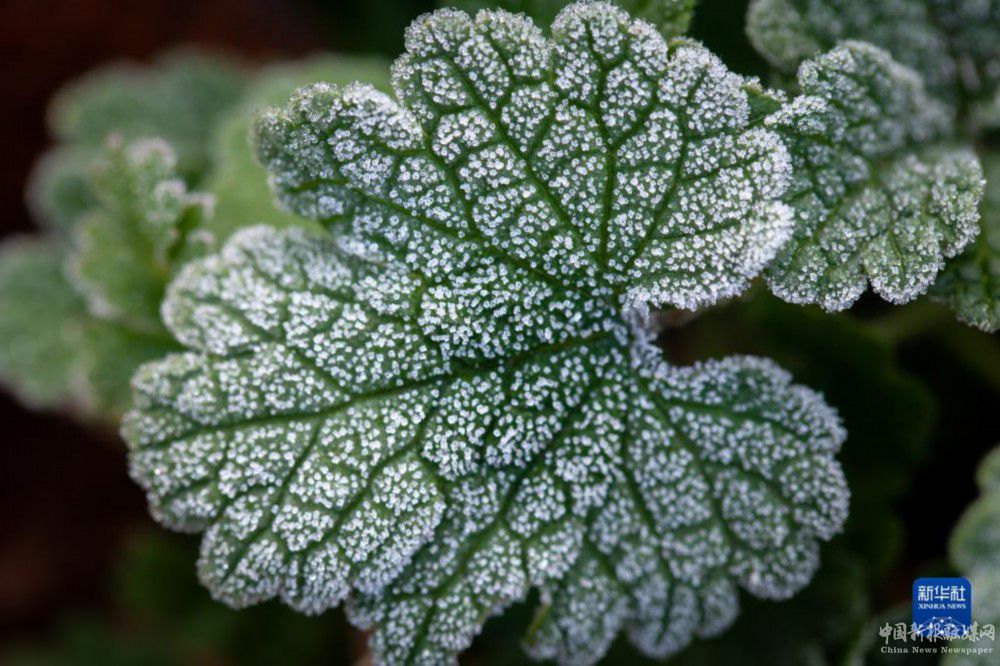 11月17日,在山東省淄博市高青縣,植物葉子上凝結(jié)了一層晨霜。