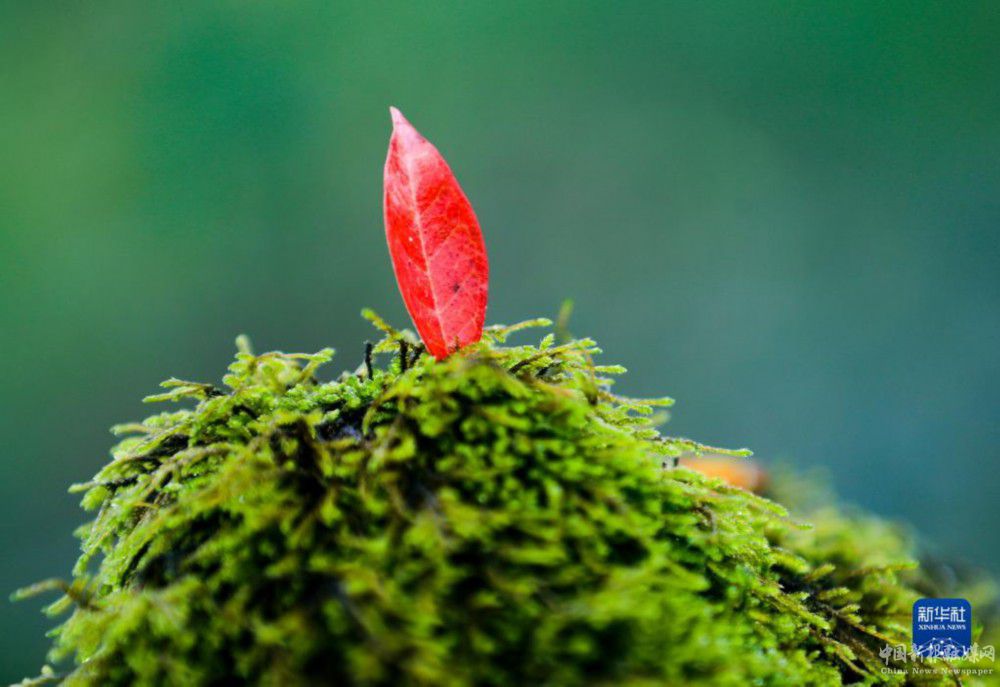 11月16日,在貴州省貴陽市息烽縣,紅葉落在苔蘚上。