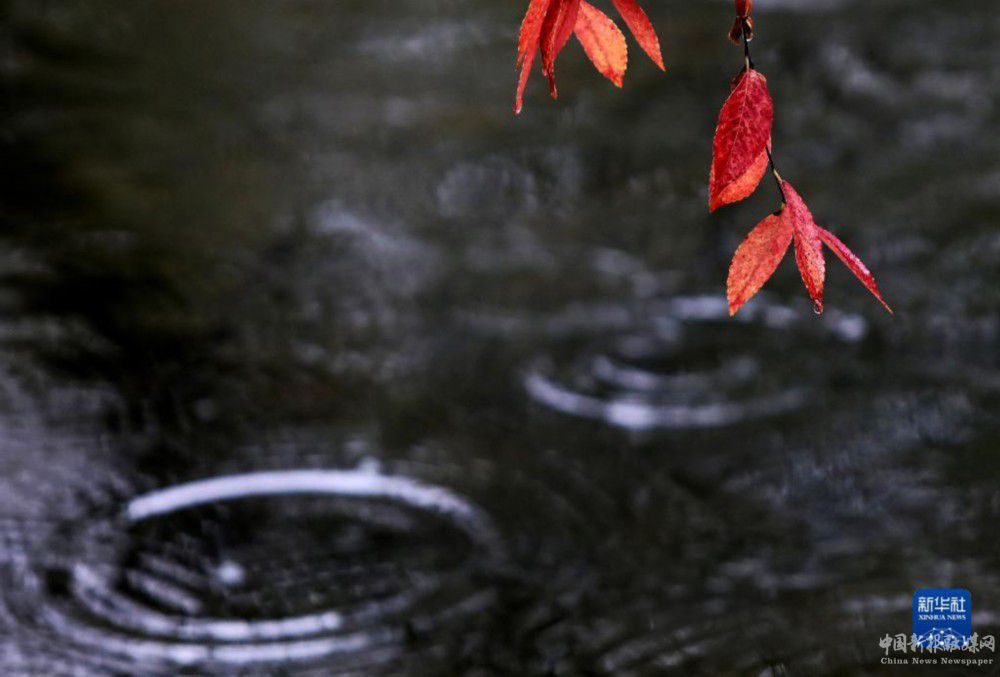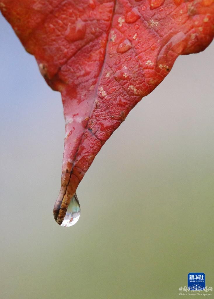 11月15日,在浙江省諸暨市次塢鎮(zhèn),紅葉上掛著水珠。