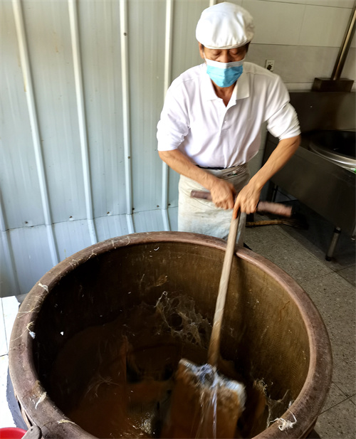 “熬糖稀非常講究,糖稀熬老了就拉不出形狀,糖稀熬嫩了吃起來(lái)就會(huì)粘牙。這個(gè)火候我們是通過(guò)三代人摸索傳承下來(lái)的,我現(xiàn)在基本上一看一瞧就知道火候。”說(shuō)起大扁糖制作工序,徐昌俠如數(shù)家珍。徐昌俠追溯到他的爺爺徐世榮、父親徐榮興,到他這里,已經(jīng)有一百多年歷史。