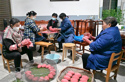 12月19日,湖南省隆回縣金石橋鎮(zhèn)黃金井村婦女在加工制作豬血丸子。進入冬季以來,該縣北部山區(qū)農(nóng)民,采用傳統(tǒng)手工藝用柴火熏制豬血丸子,通過線上線下銷往全國各地,已逐漸成為全國各大城市餐桌上的特色美味佳肴,助力鄉(xiāng)村產(chǎn)業(yè)振興。(賀上升攝)