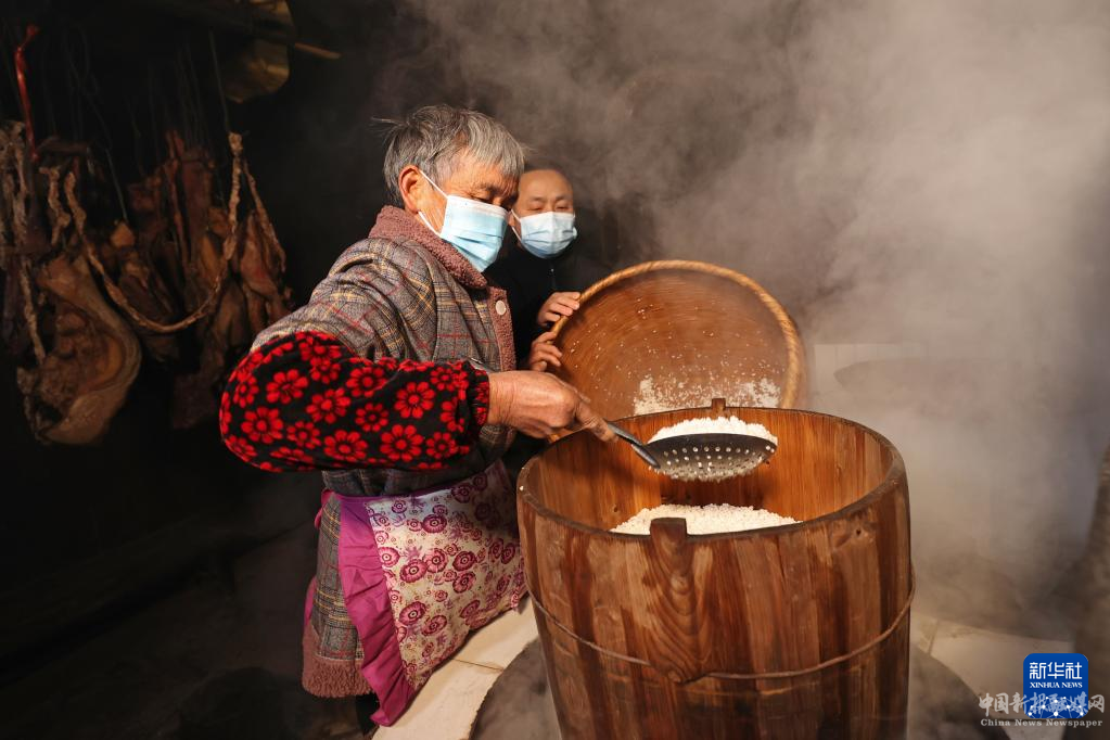 12月27日,岑鞏縣水尾鎮(zhèn)馬家寨村村民將泡好的糯米放入甑子蒸煮。
