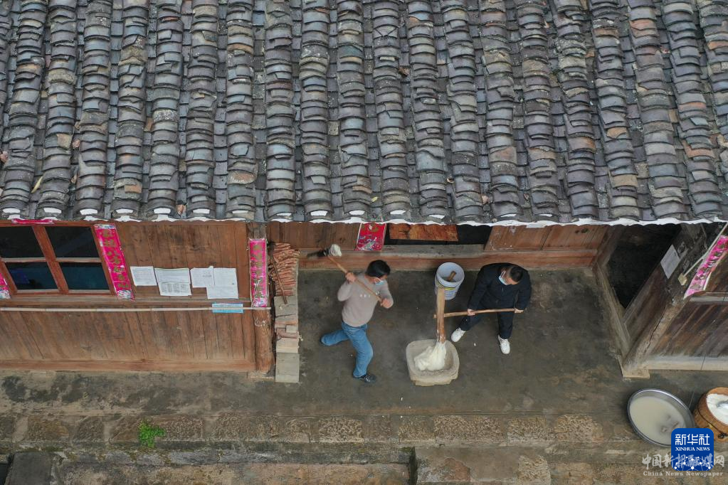 12月27日,岑鞏縣水尾鎮(zhèn)馬家寨村村民將糯米搗成糯米糍粑(無(wú)人機(jī)照片)。