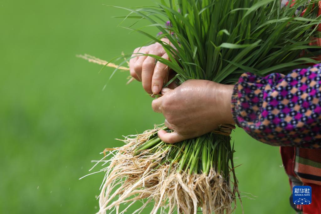 6月7日,村民在貴州省黔東南苗族侗族自治州岑鞏縣大有鎮(zhèn)臘恰畈村起秧苗。