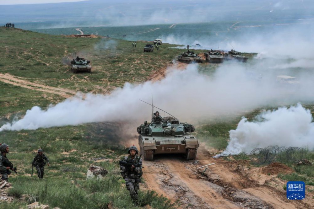 “跨越-2016·朱日和A”演習進入實兵對抗陣地進攻戰(zhàn),這是紅藍雙方首場對抗中紅軍步兵和坦克協(xié)同(2016年7月19日攝)。新華社發(fā)(王佳寅 攝)