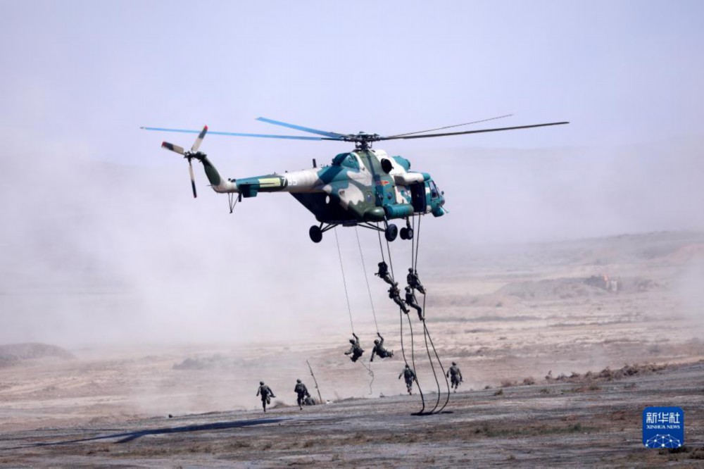 2021年8月13日,在寧夏某合同戰(zhàn)術訓練基地“西部·聯(lián)合-2021”第二階段聯(lián)合實兵行動演練中,運輸直升機搭載陸軍特戰(zhàn)小隊至預定區(qū)域,特戰(zhàn)隊員實施索降。新華社記者 劉芳 攝
