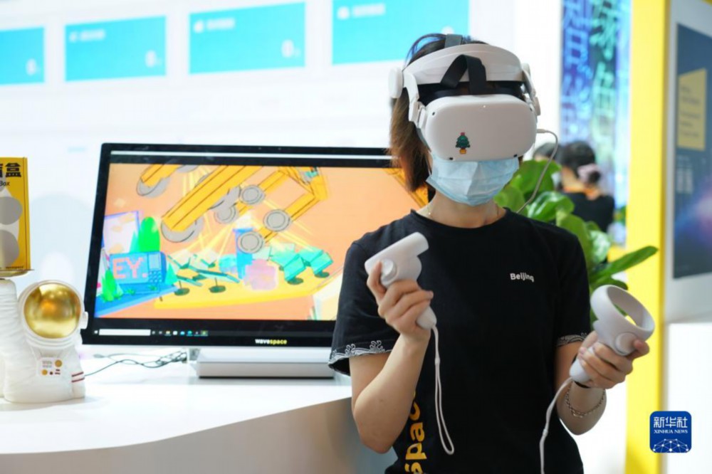 8月28日,在國家會議中心一期,2022年服貿(mào)會一家展臺的工作人員通過VR設備進行沉浸式元宇宙協(xié)作繪畫演示。新華社記者 任超 攝