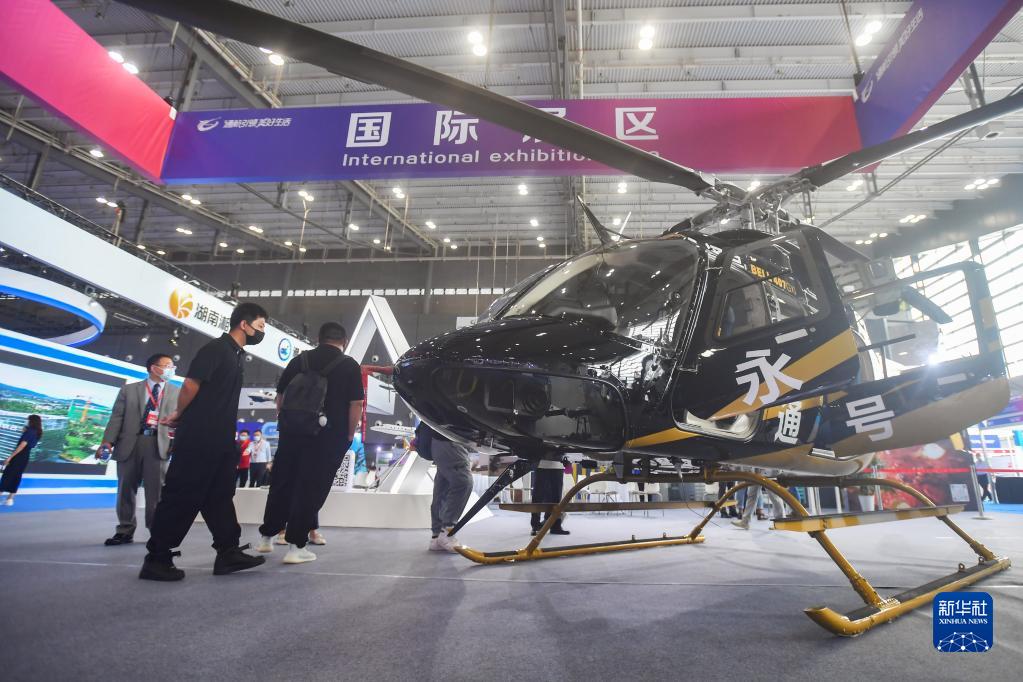 這是9月1日在湖南長沙國際會展中心拍攝的博覽會上的一架直升機。
