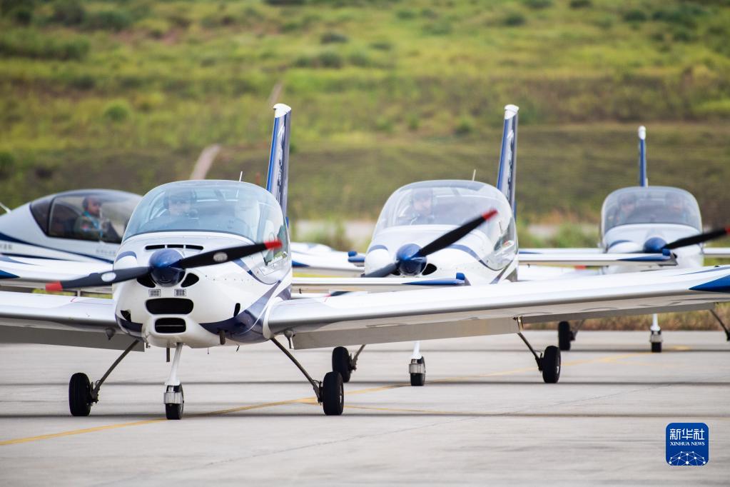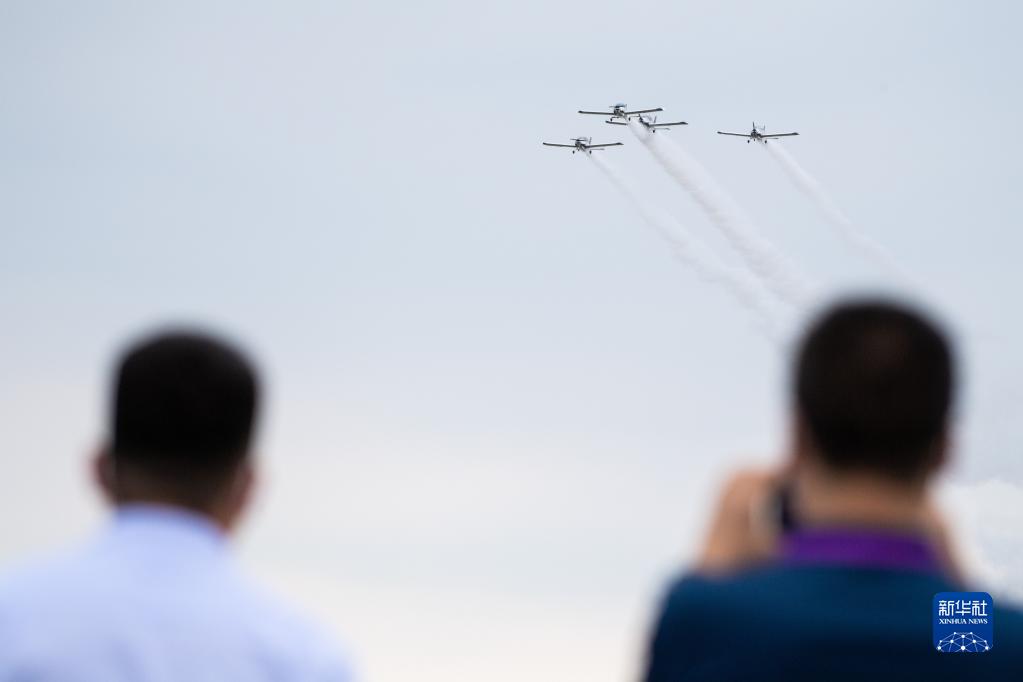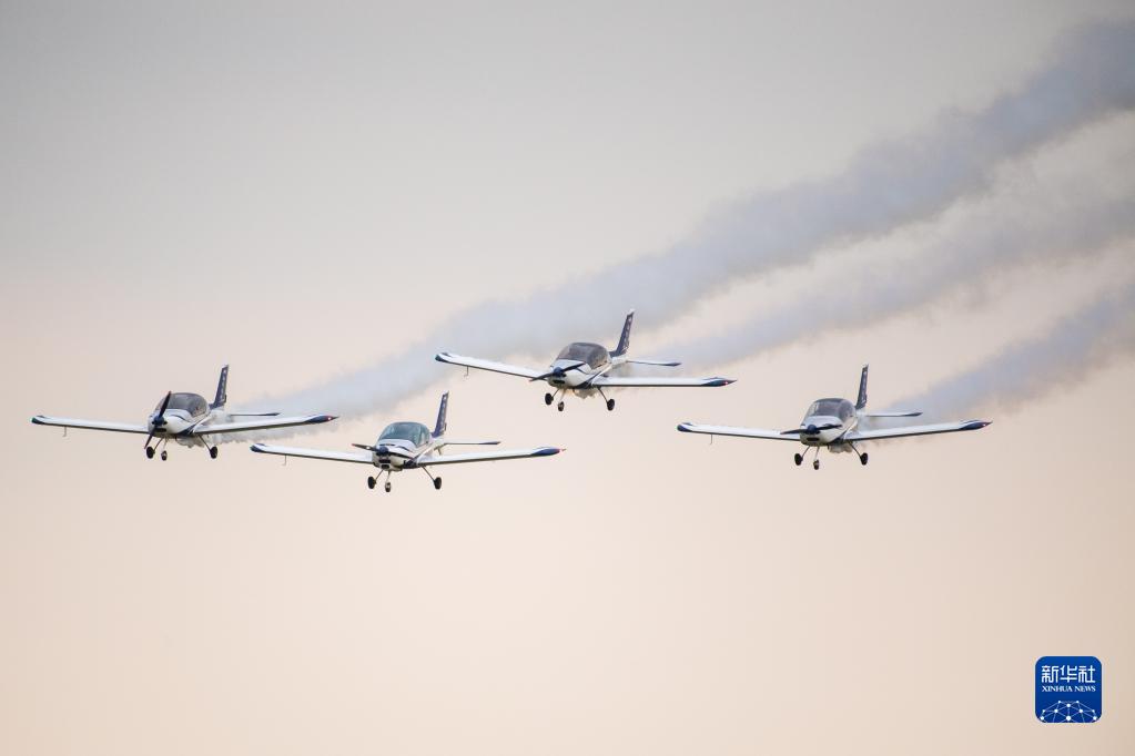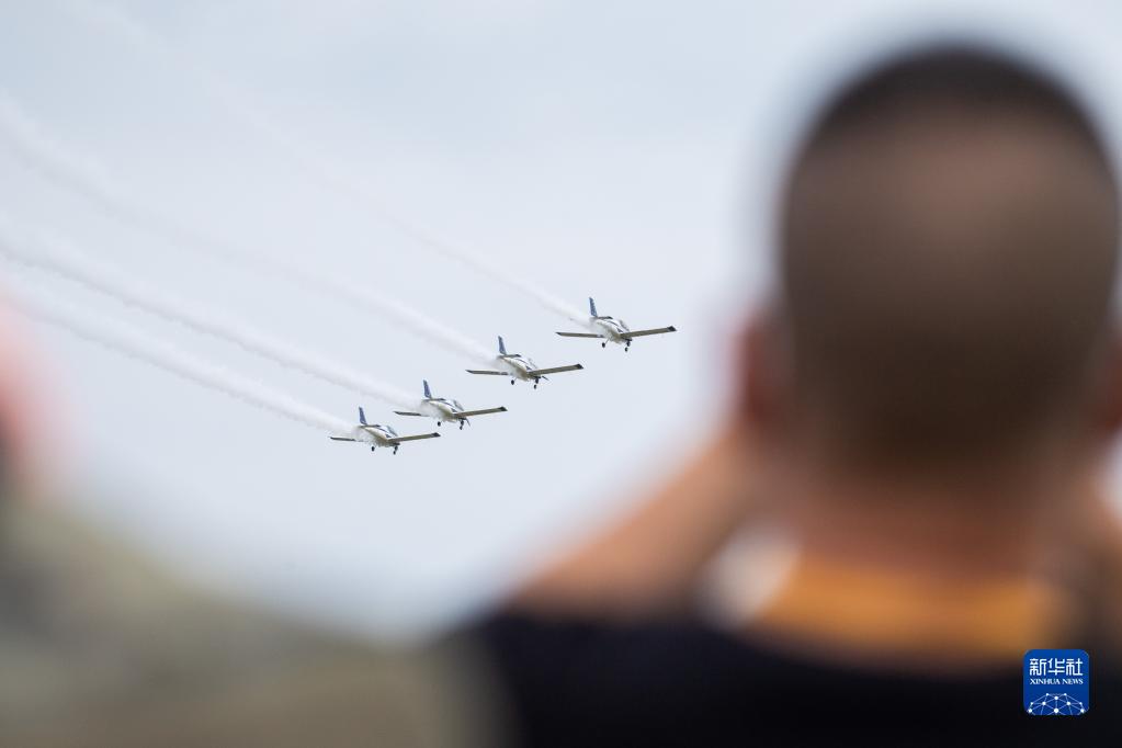 9月1日,在湖南株洲蘆淞機場,飛行員進行固定翼編隊飛行表演。