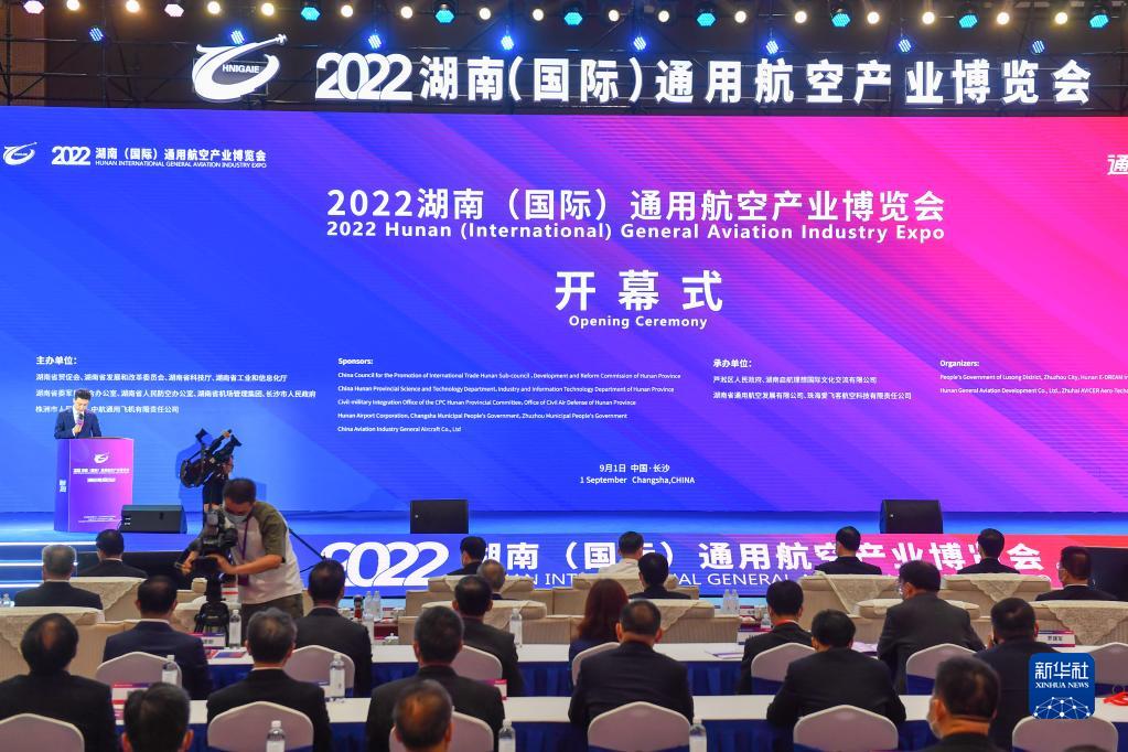 這是9月1日在湖南長沙國際會展中心拍攝的2022湖南(國際)通用航空產(chǎn)業(yè)博覽會開幕式現(xiàn)場。