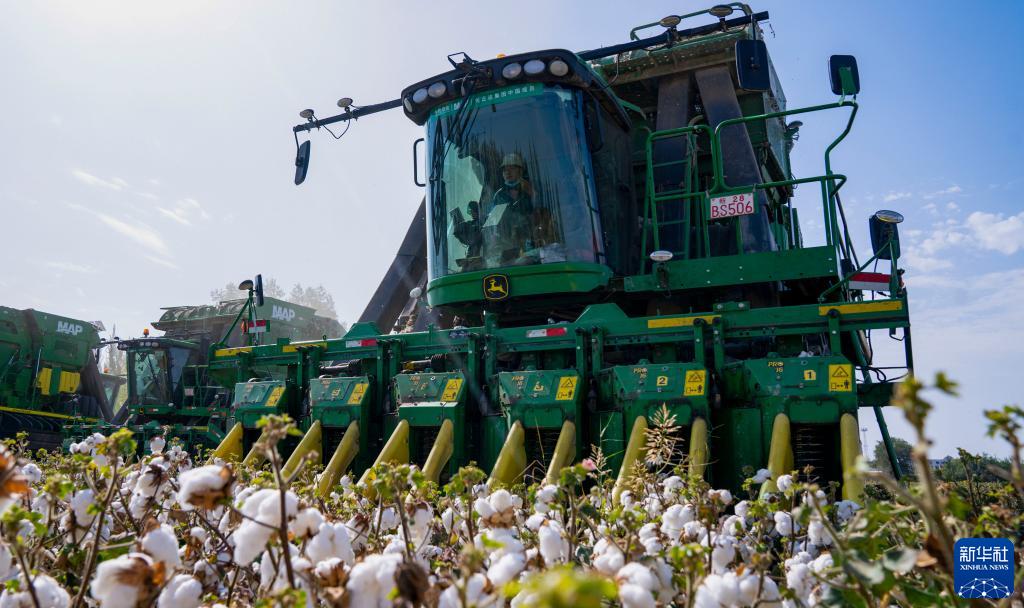9月23日,采棉機(jī)在新疆沙灣市老沙灣鎮(zhèn)的棉田里采收棉花。