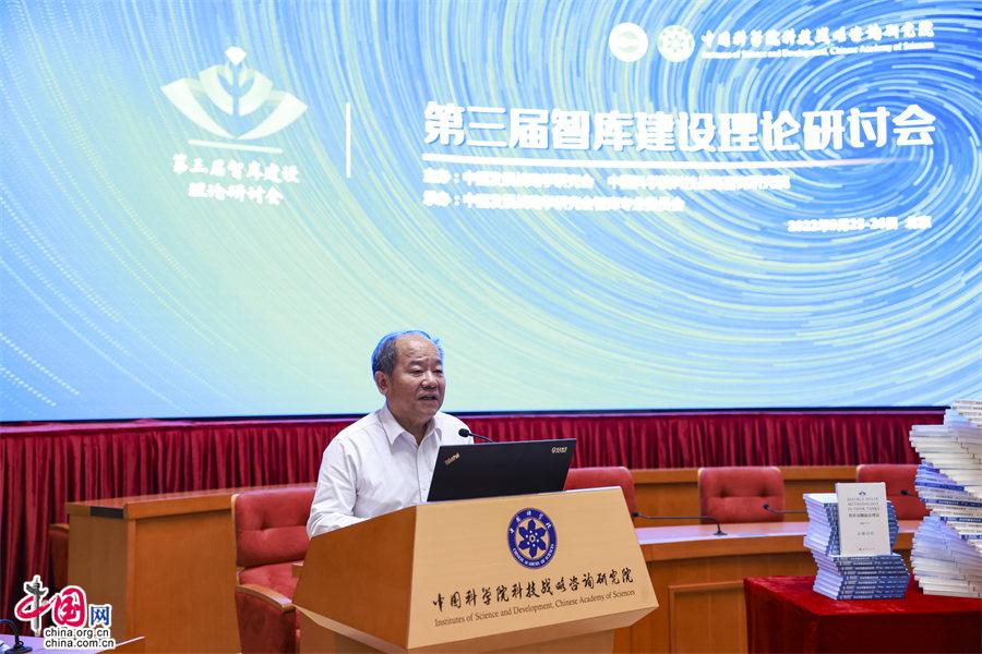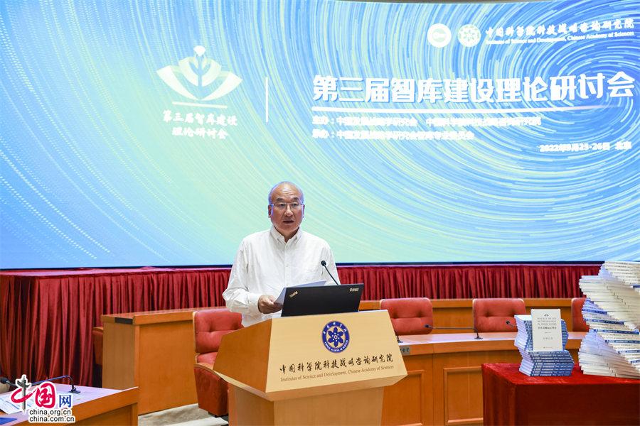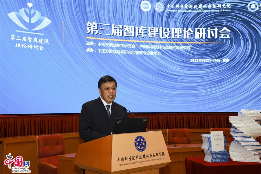 中國網(wǎng)/中國發(fā)展門戶網(wǎng)訊  (記者王振紅)9月25日,由中國發(fā)展戰(zhàn)略學(xué)研究會與中國科學(xué)院科技戰(zhàn)略咨詢研究院(以下簡稱戰(zhàn)略咨詢院)共同主辦,中國發(fā)展戰(zhàn)略學(xué)研究會智庫專業(yè)委員會(以下簡稱智庫專委會)承辦的第三屆智庫建設(shè)理論研討會在京舉行,會期二天。會議由主論壇、專題論壇和閉門會等組成,會上發(fā)布了戰(zhàn)略咨詢院最新智庫理論研究成果《智庫雙螺旋法理論》《智庫雙螺旋法應(yīng)用》(一、二)三部著作。