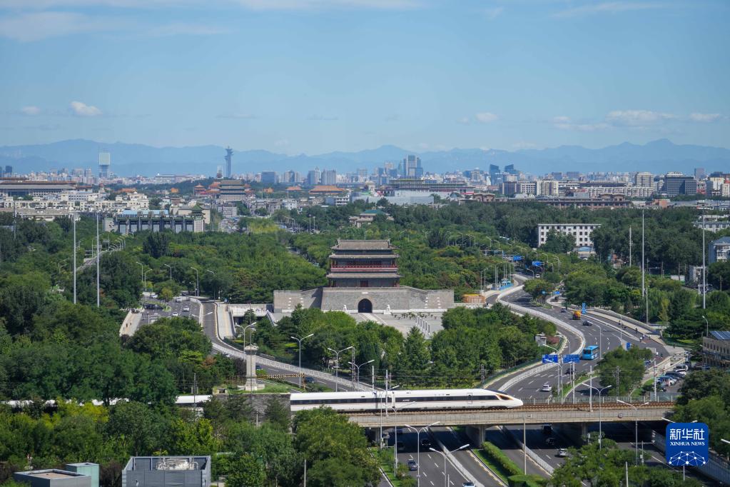 2022年8月16日,一列復(fù)興號(hào)高鐵列車從位于北京中軸線上的永定門城樓前駛過。新華社記者 鞠煥宗 攝