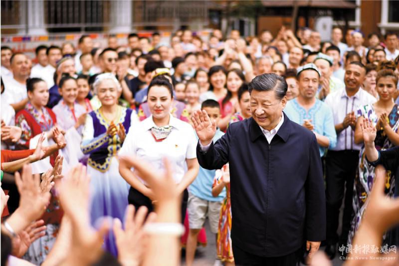 圖:2022年7月13日,習(xí)近平在新疆維吾爾自治區(qū)烏魯木齊市天山區(qū)固原巷社區(qū)考察時,向各族群眾揮手致意。 /新華社