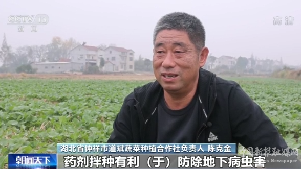 湖北省鐘祥市道斌蔬菜種植合作社負責人 陳克金:藥劑拌種有利于防除地下病蟲害,促進油菜平衡生長,北斗導航可以精準控制播種質量。