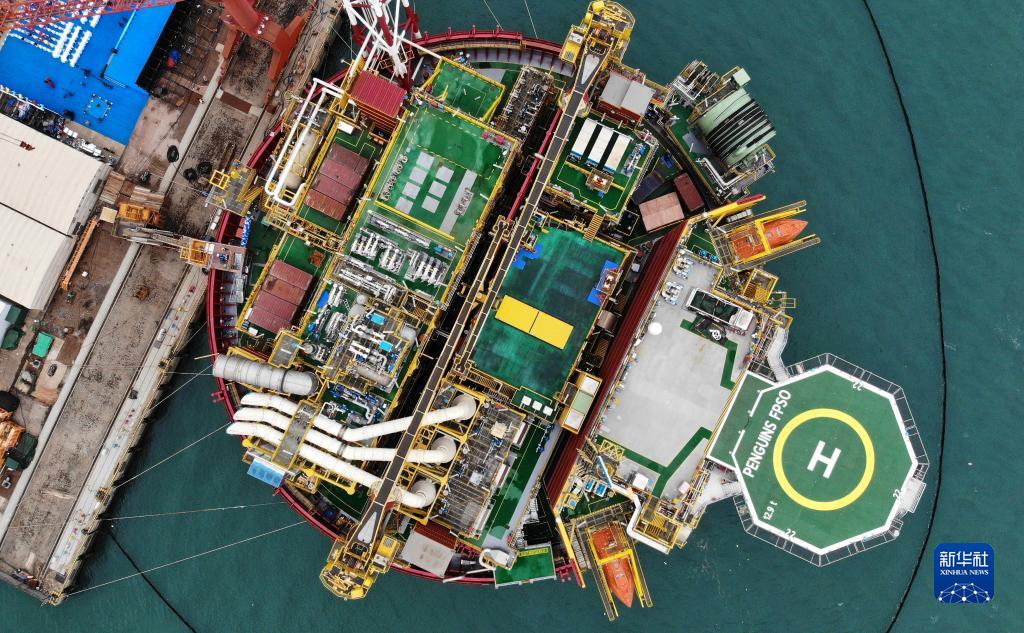 這是11月29日在山東青島拍攝的企鵝圓筒型浮式生產(chǎn)儲(chǔ)卸油裝置(FPSO)(無(wú)人機(jī)照片)。