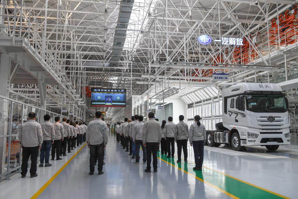 12月6日上午,中共中央、全國人大常委會、國務院、全國政協(xié)、中央軍委在北京人民大會堂隆重舉行江澤民同志追悼大會。舉國上下,各族人民沉痛悼念江澤民同志。這是在吉林長春的一汽解放工廠車間,工人們收看江澤民同志追悼大會直播。新華社記者 張楠 攝