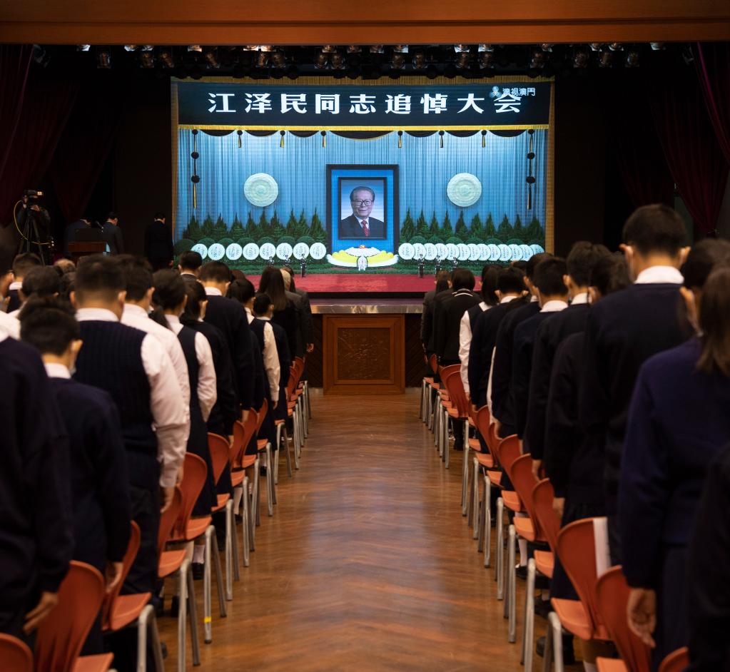 12月6日上午,中共中央、全國人大常委會、國務院、全國政協(xié)、中央軍委在北京人民大會堂隆重舉行江澤民同志追悼大會。舉國上下,各族人民沉痛悼念江澤民同志。這是在澳門濠江中學,師生肅立默哀。新華社記者 張金加 攝