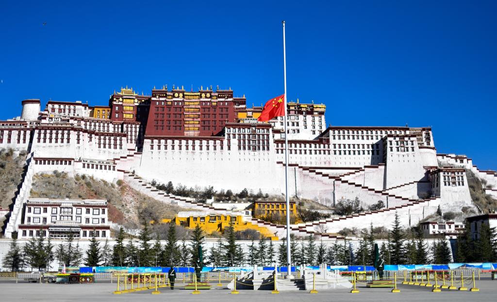 12月6日上午,中共中央、全國人大常委會、國務院、全國政協(xié)、中央軍委在北京人民大會堂隆重舉行江澤民同志追悼大會。舉國上下,各族人民沉痛悼念江澤民同志。這是西藏拉薩布達拉宮廣場下半旗志哀。新華社記者 張汝鋒 攝