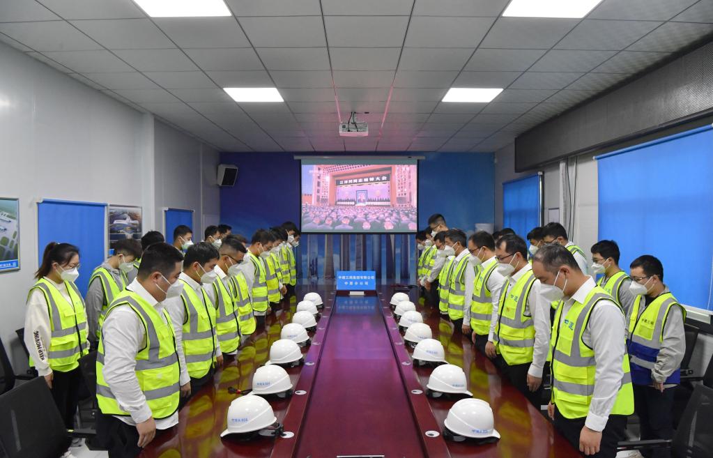 12月6日上午,中共中央、全國人大常委會、國務院、全國政協(xié)、中央軍委在北京人民大會堂隆重舉行江澤民同志追悼大會。舉國上下,各族人民沉痛悼念江澤民同志。這是在河南鄭州中原數(shù)字產(chǎn)業(yè)園(西園)項目工地,中建三局的建設者肅立默哀。新華社記者 李嘉南 攝