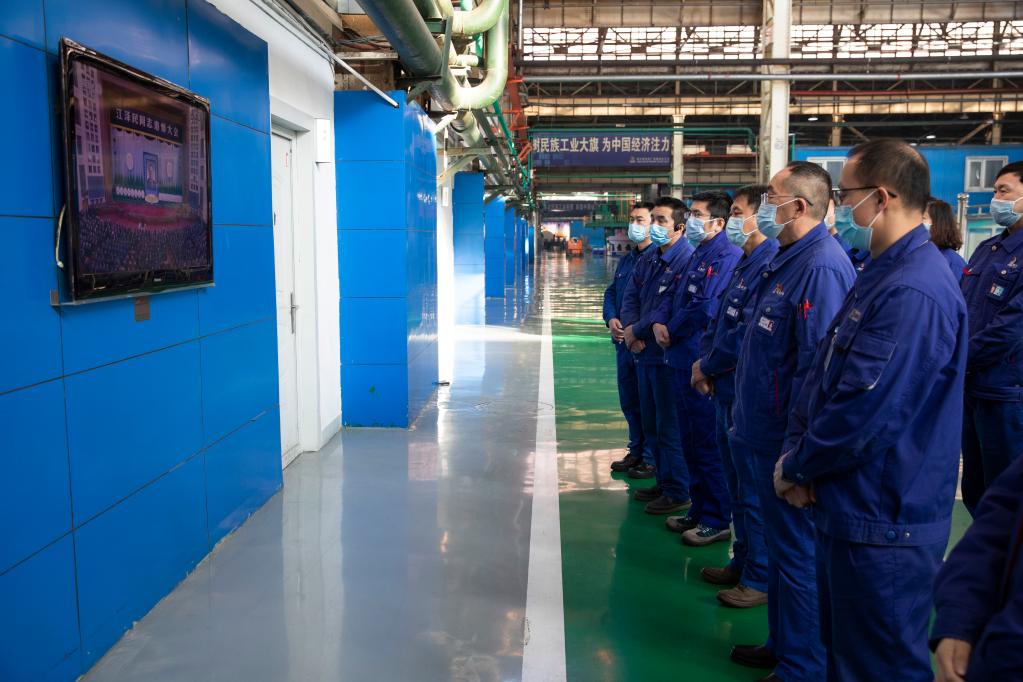 12月6日上午,中共中央、全國人大常委會、國務院、全國政協(xié)、中央軍委在北京人民大會堂隆重舉行江澤民同志追悼大會。舉國上下,各族人民沉痛悼念江澤民同志。這是在哈電集團哈爾濱電機廠有限責任公司,職工收看江澤民同志追悼大會直播。新華社記者 張濤 攝