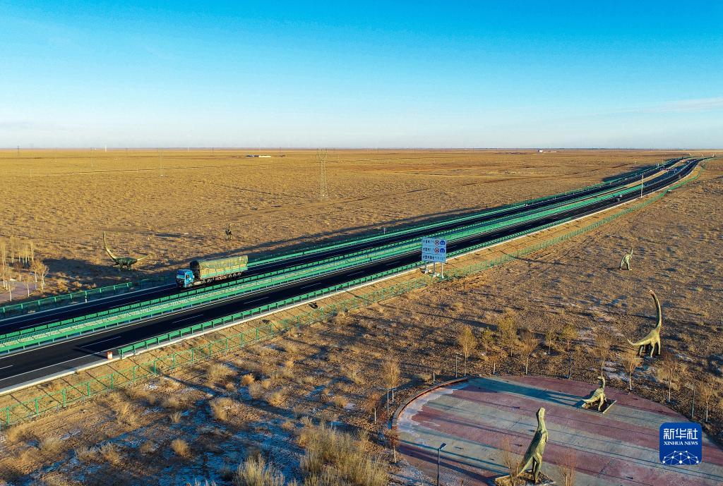 12月16日,車輛在二廣高速內(nèi)蒙古二連浩特至賽漢塔拉段上行駛(無人機照片)。