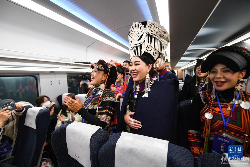 12月26日,彝族群眾在新成昆鐵路首發(fā)列車上為乘客表演節(jié)目。