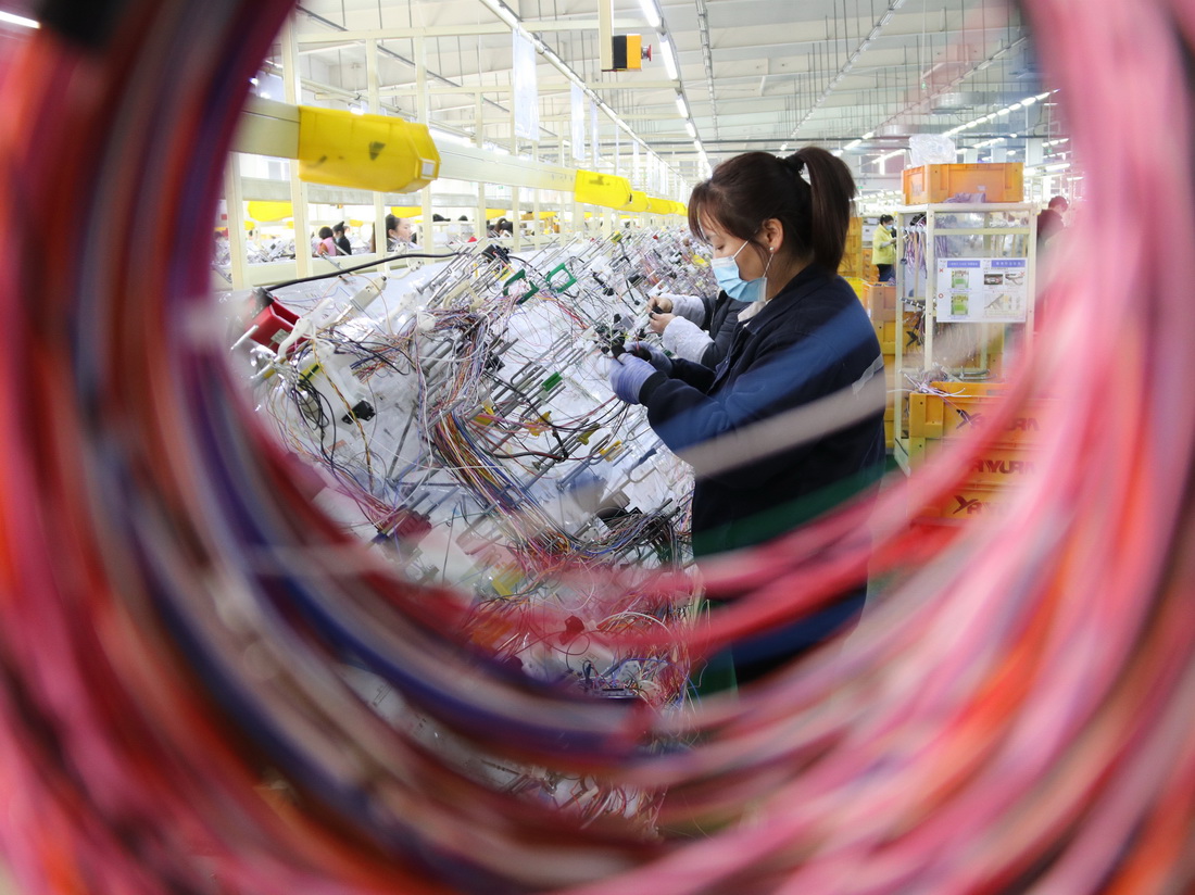 2月7日,工人在山東省菏澤市牡丹區(qū)王浩屯鎮(zhèn)一家企業(yè)加工車用線束。新華社發(fā)(郜玉華 攝)