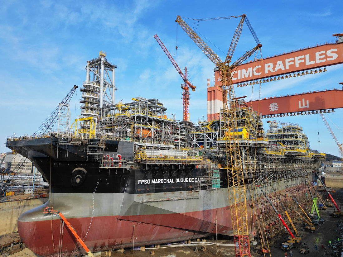 這是2月7日在中集來福士山東煙臺(tái)建造基地拍攝的建造中的大型浮式生產(chǎn)儲(chǔ)卸油船(無人機(jī)照片)。新華社發(fā)(唐克 攝)