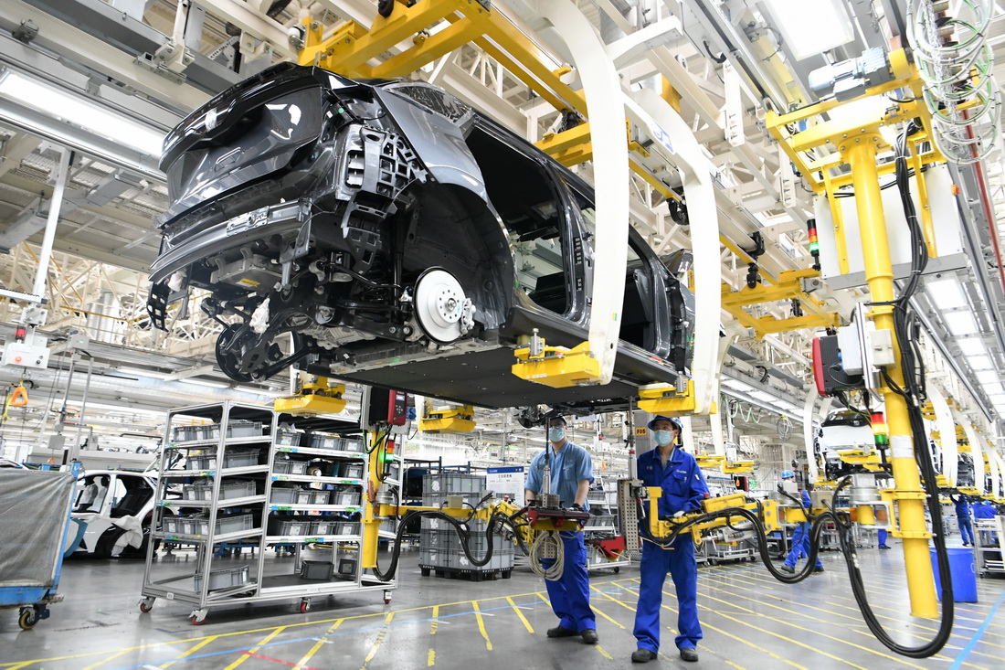 2月7日,工人在上汽集團(tuán)乘用車福建寧德基地總裝車間生產(chǎn)線上進(jìn)行車身零部件組裝。新華社發(fā)(王旺旺 攝)