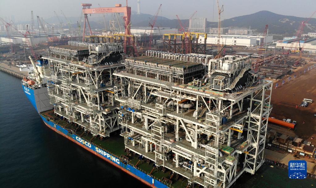 3月7日,加拿大LNG項目最后兩個核心工藝模塊在青島場地裝船(無人機(jī)照片)。