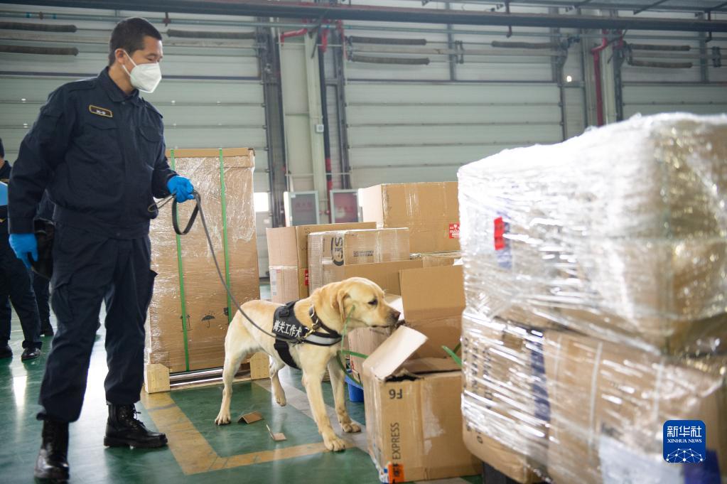 3月20日,首都機場海關關員使用檢疫犬在海關監(jiān)管的快件倉庫查驗快件。