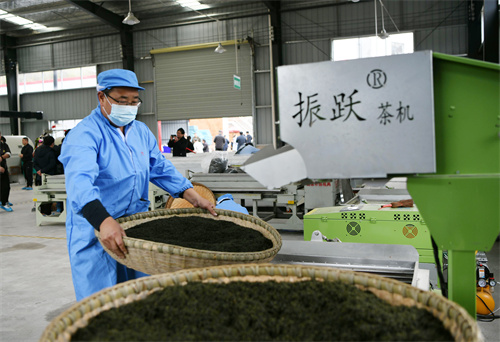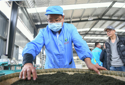 2023年3月22日,在貴州省凱里市碧波鎮(zhèn)王義村,一名工人在茶葉生產(chǎn)車(chē)間制茶。(楊仁海 攝 )