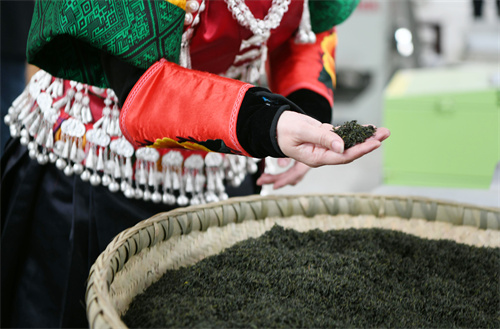 2023年3月22日,在貴州省凱里市碧波鎮(zhèn)王義村,一名游客在茶葉生產(chǎn)車(chē)間查看干茶。(楊仁海 攝 )