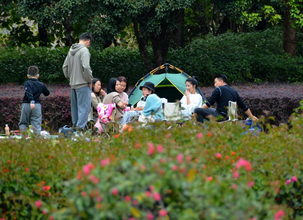 3月12日,市民在福州市花海公園周邊草坪上搭起帳篷樂享周末。新華社記者 魏培全 攝