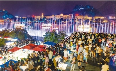 “五一”假期,廣西壯族自治區(qū)柳州市美輪美奐的城市夜景和豐富的夜間經(jīng)濟消費業(yè)態(tài),吸引眾多游客慕名而來。如今,“夜經(jīng)濟”已經(jīng)成為當(dāng)?shù)乩瓌酉M的“新引擎”,為城市經(jīng)濟社會發(fā)展注入新動能。圖為游客在柳州市柳江河畔觀看水上音樂噴泉。
