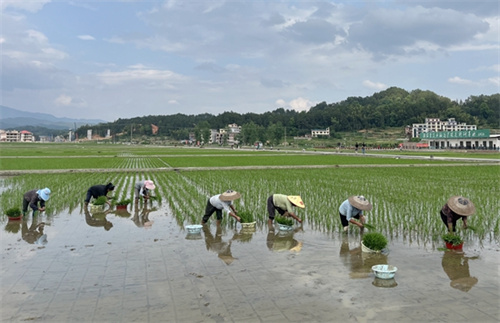 5月27日,隆回縣羊古坳鎮(zhèn)雷峰村超級稻高產(chǎn)攻關(guān)科研基地,農(nóng)民們搶抓農(nóng)時,卷起褲腿埋頭彎腰,將一棵棵秧苗移栽到水田中,為再次沖刺單季畝產(chǎn)1200公斤栽種希望。