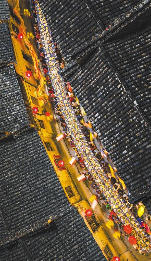 ④安徽省寧國市胡樂老街,游客在體驗(yàn)長桌宴,感受古鎮(zhèn)濃濃的民風(fēng)民俗。