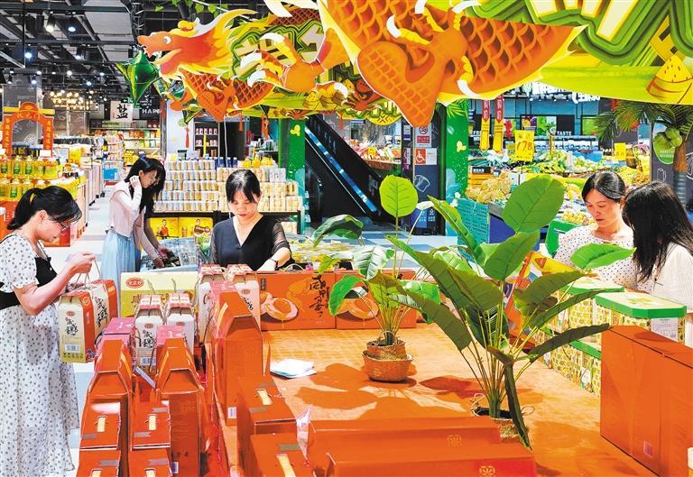 ?、兕櫩驮诮魇↓埬鲜邪僖踪徫飶V場(chǎng)“端午消費(fèi)區(qū)”選購食品。該市多家商超推出線上線下同步的滿減活動(dòng),助推假日消費(fèi)。李林烜攝(中經(jīng)視覺)