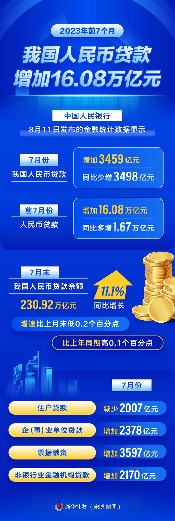 新華社北京8月11日電 中國人民銀行11日發(fā)布的金融統(tǒng)計數(shù)據(jù)顯示,7月份我國人民幣貸款增加3459億元,同比少增3498億元。前7個月人民幣貸款增加16.08萬億元,同比多增1.67萬億元。