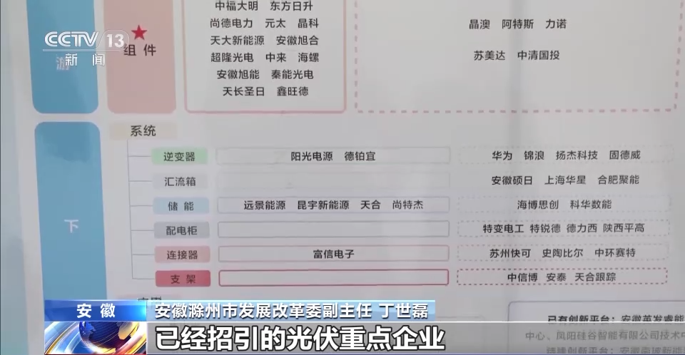 安徽滁州市發(fā)展改革委副主任 丁世磊:實框里是我們已經(jīng)招引的光伏重點企業(yè),虛框里是待招引的企業(yè),空白是薄弱環(huán)節(jié)。加大招引力度,聚力打造產(chǎn)業(yè)規(guī)模大、龍頭企業(yè)多、產(chǎn)業(yè)生態(tài)完善的垂直一體化光伏產(chǎn)業(yè)鏈條。