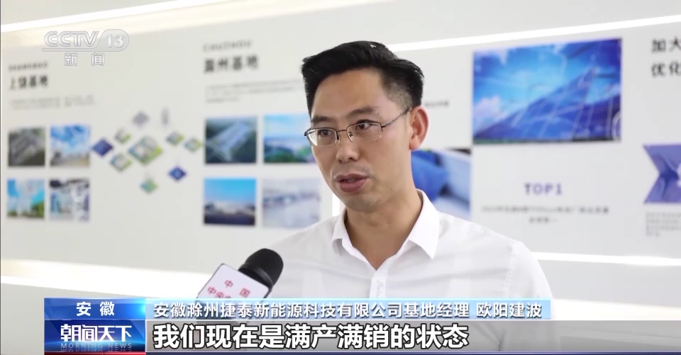 安徽滁州捷泰新能源科技有限公司基地經(jīng)理 歐陽建波:我們現(xiàn)在是滿產(chǎn)滿銷的狀態(tài),每天生產(chǎn)大概620多萬片電池片,今年預(yù)計上半年的銷售額超65億元,預(yù)計今年整年的銷售額在120億元以上。
