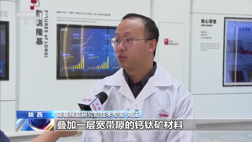 隆基綠能研究院技術(shù)專家 劉江:就是在原有的晶硅太陽能電池上面,疊加一層寬帶隙的鈣鈦礦材料,通過這樣一個結(jié)構(gòu)可以更加充分、更加有效地利用可見光的光能。通過疊層的技術(shù)路線,它的理論極限效率可以進一步達到43%。