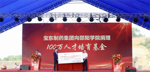 開工儀式現(xiàn)場(chǎng),湖南寶東制藥集團(tuán)董事長(zhǎng)李君彥致辭,并向邵陽學(xué)院捐贈(zèng)100萬元用于人才培育;江蘇邵陽商會(huì)向湖南寶東制藥集團(tuán)授予“江蘇邵陽商會(huì)邵陽聯(lián)絡(luò)處”牌匾。